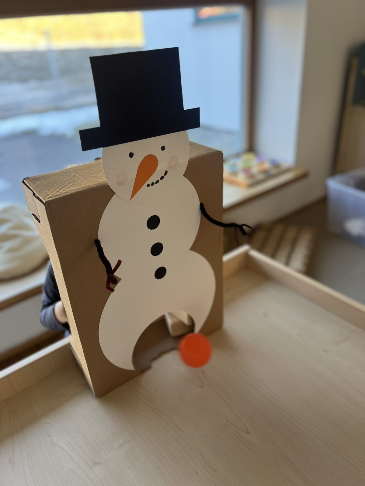 Tischfußball einmal ganz anders! Ein Schneemann, der auf einer Schachtel pickt, hat eine Öffnung in der untersten Kugel. Die Aufgabe der kleinen Piepmätze ist es