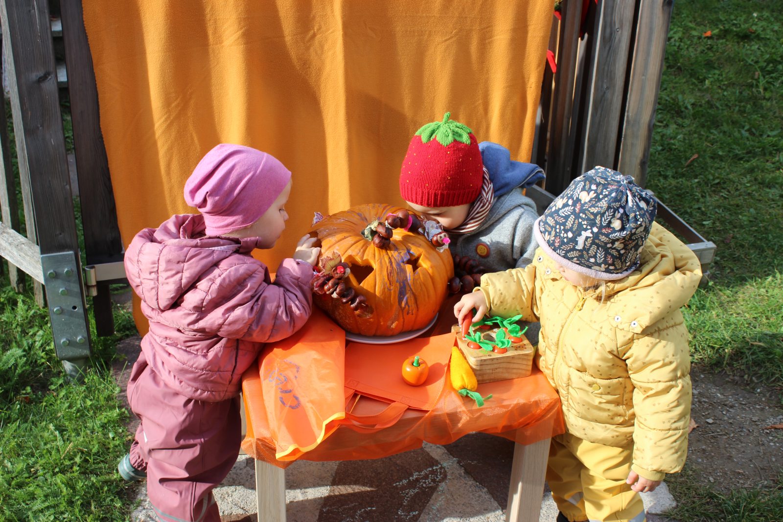 Orange! Orange! Alles ist Orange! Es muss Kürbiszeit sein. Jeder Monat hat in der Piepmatz-Kinderkrippe St. Radegund eine bestimmte Farbe. So hat der Monat Oktober
