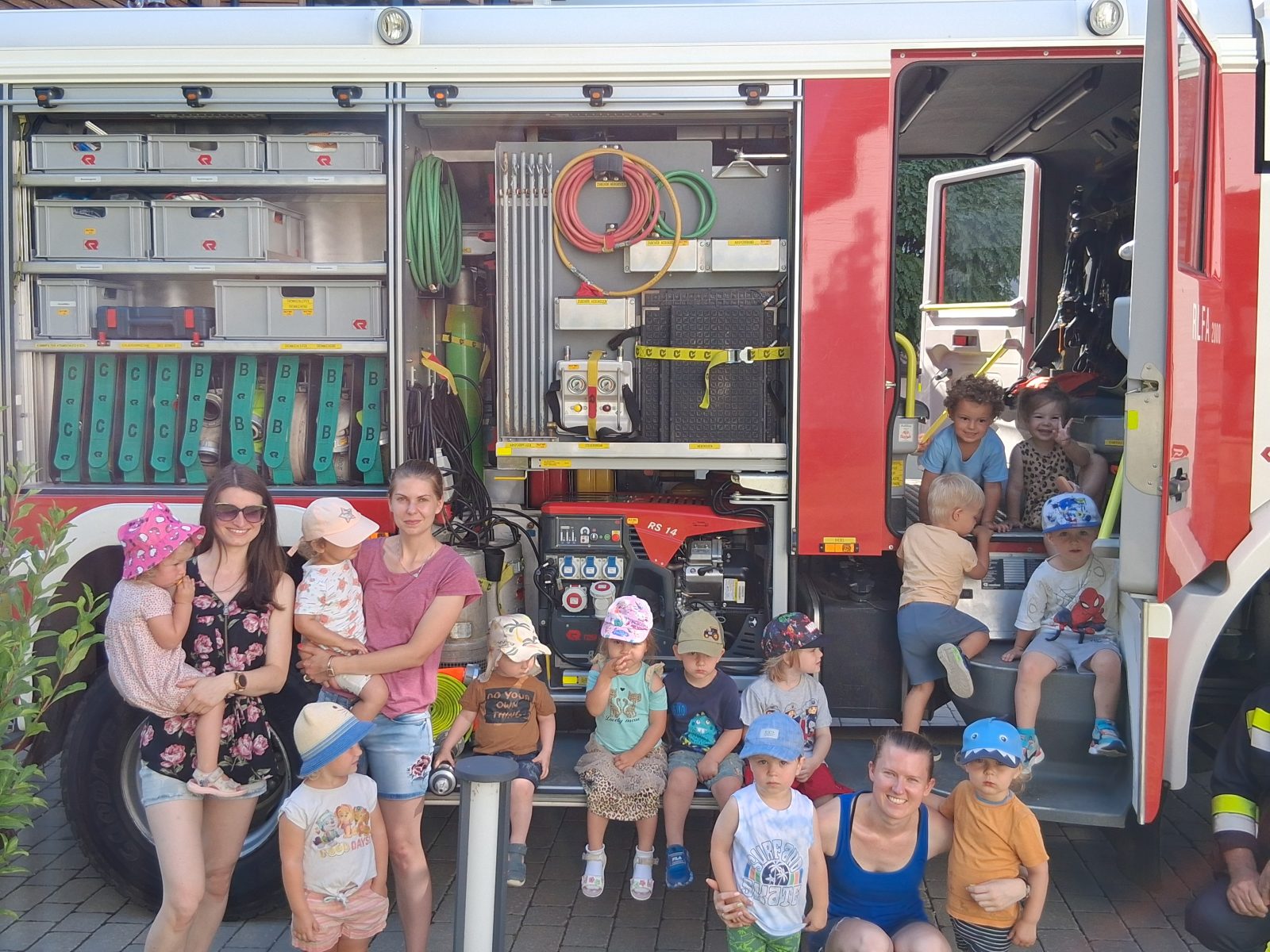 Eines ist sicher: Wenn die Feuerwehr kommt geht es rund! Zum Glück brannte es in der Kinderkrippe nirgendwo. Aber so ein Feuerwehrauto ist einfach zu