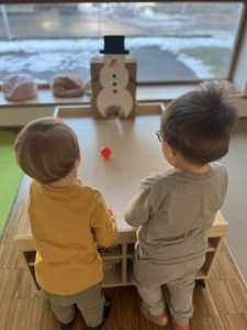 Tischfußball einmal ganz anders! Ein Schneemann, der auf einer Schachtel pickt, hat eine Öffnung in der untersten Kugel. Die Aufgabe der kleinen Piepmätze ist es nun, den kleinen roten Ball mit viel Gefühl in die Öffnung zu rollen. Treffer! Perfekt!