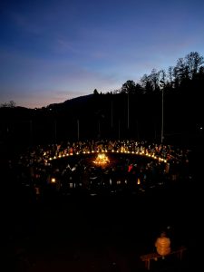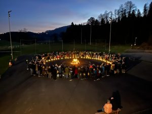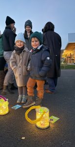Als es am 11. November abends langsam dunkel wurde, erleuchtete eine Laterne um die andere den großen Platz. Die Kindergartenkinder hatten ihre Laterne zum Fest mitgebracht und stellten sich im Kreis auf und zahlreiche Gäste gesellten sich zu ihnen. Die einstudierten Lieder und kurzen Gedichte wurden mit Begeisterung vorgetragen. Es verbreitete sich eine heimelige, adventliche Stimmung. Im Anschluss gab es noch einen köstlichen Imbiss und heiße Getränke zum Aufwärmen. Herzlichen Dank für die süßen und pikanten Köstlichkeiten, die von den Eltern zur Verfügung gestellt worden waren.